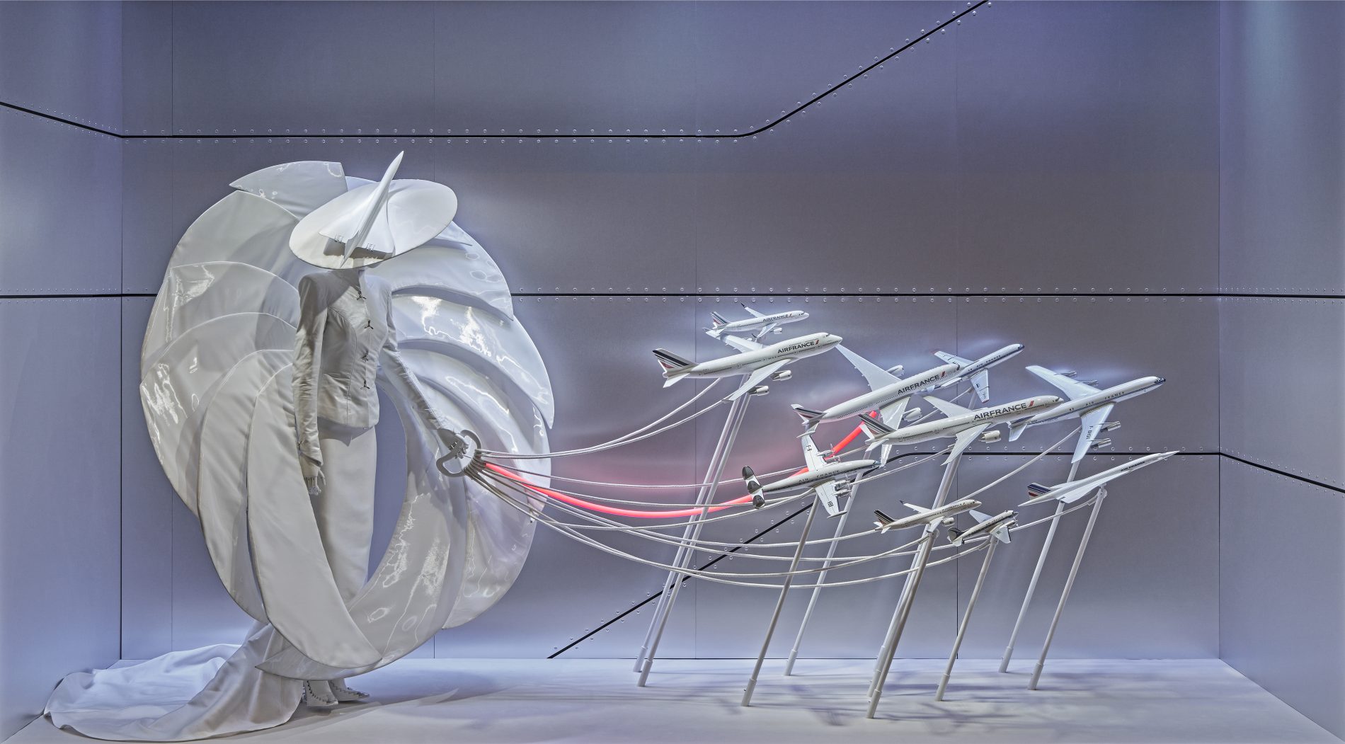 A Air France naturalmente escolheu a Galeries Lafayette, um templo da moda no coração de Paris, para apresentar esta coleção original de vestidos como parte das celebrações de aniversário. De 28 de setembro a 10 de outubro de 2023, a companhia faz uma retrospectiva de sua história lendária e da elegância nas alturas, com o objetivo de seguir avançando e abraçar o futuro nas vitrines da loja. Os vestidos são exibidos entre uma seleção de itens do patrimônio da Air France e o melhor da oferta atual da companhia para destacar os 90 anos de aeronaves lendárias, conforto, uniformes de designers icônicos, gastronomia e design a bordo.