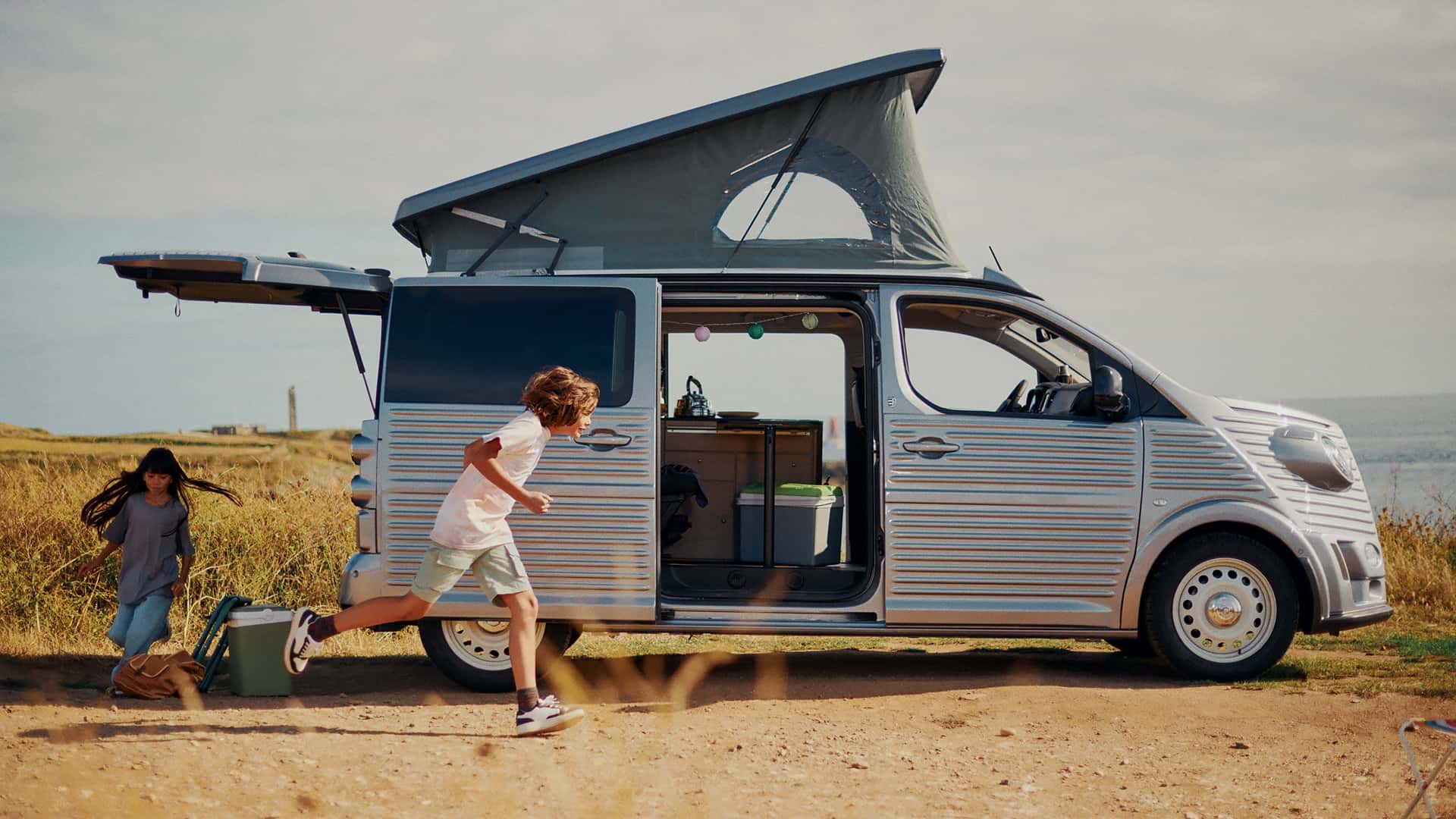 Como no Volkswagen California Concept, a Citroën acrescenta uma segunda porta deslizante no lado esquerdo da van. É também aí que se localiza a cozinha compacta, permitindo o acesso tanto ao interior quanto ao exterior. Uma pia e uma geladeira estão incluídas, e uma mesa dobrável com assentos dianteiros giratórios em 180 graus cria uma área de jantar aconchegante. Quanto à parte externa, a Citroën fez uma parceria com o construtor de carrocerias italiano Caselani para o visual antigo.