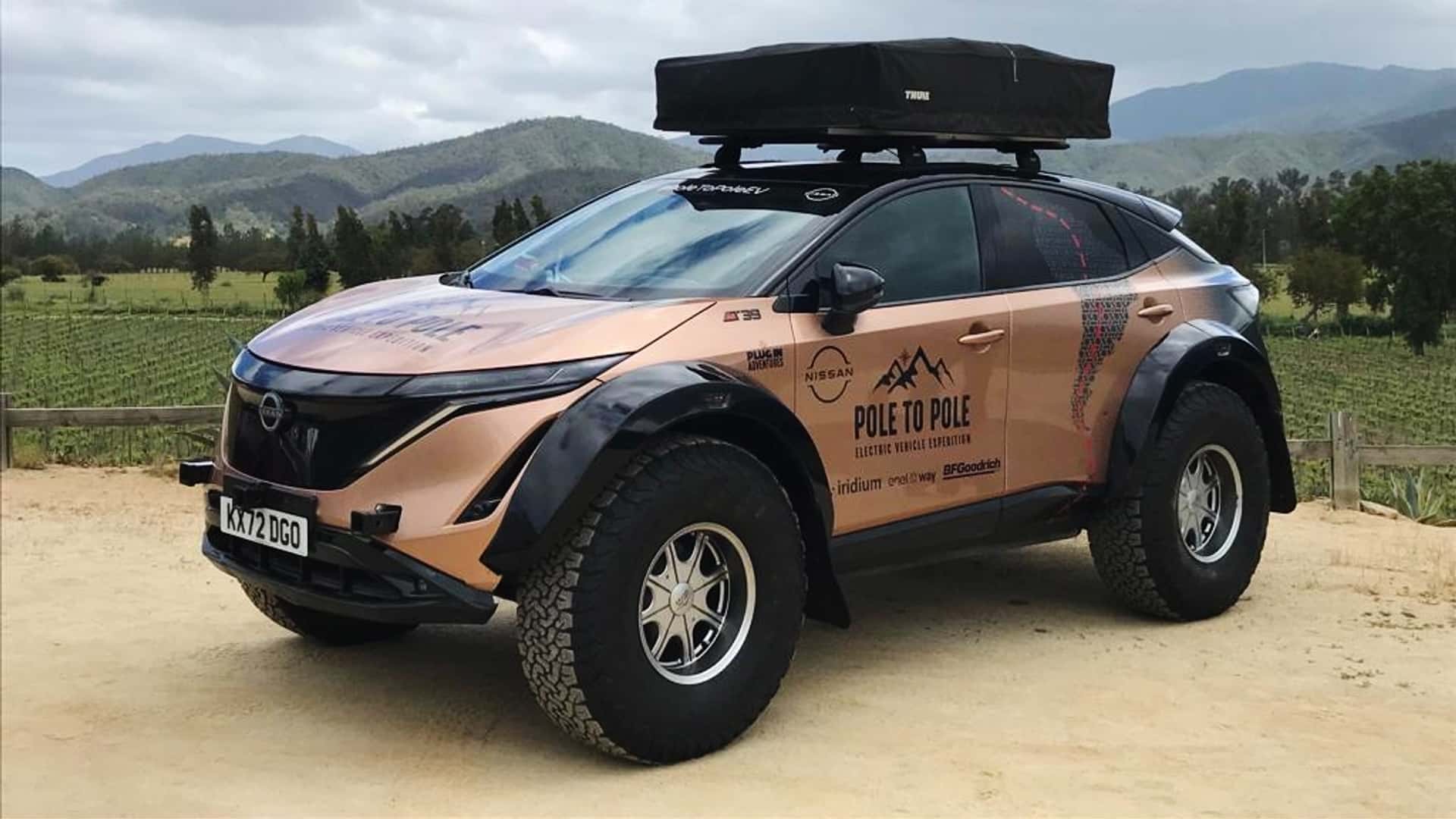 O modelo usado na épica viagem “Pole to Pole” é um Nissan Ariya, um crossover japonês 100% elétrico (como referência, esse Nissan tem o porte aproximado de um Honda CR-V). O Ariya dos aventureiros chama um bocado de atenção por seus enormes pneus tipo tundra, feitos para vencer gelo fofo ou lagos gelados, além dos arcos dos para-lamas aumentados e alargados. Fora isso, não houve modificações técnicas sequer na bateria, de 87 kWh. Encontramos o simpático casal de viajantes numa parada em Santiago, no Chile.