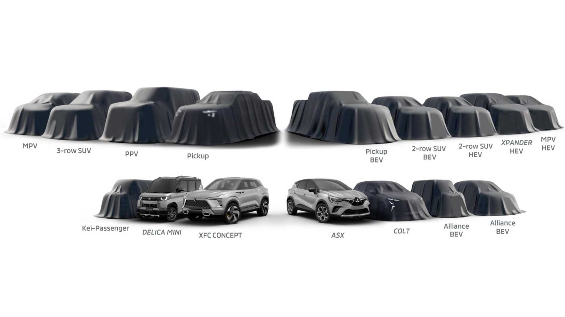 Dos 16 modelos anunciados, 14 ainda são inéditos e serão revelados no decorrer dos próximos 5 anos. Os outros dois compõem o calendário, mas já são conhecidos: o crossover ASX para a Europa (clone do Renault Captur) e kei car Delica Mini (oferecido exclusivamente no Japão). Os próximos lançamentos, programados ainda para este ano, são a nova geração da picape L200 Triton e a versão de produção do XFC Concept (SUV rival do Hyundai Creta).Mitsubishi – Calendário de lançamentos