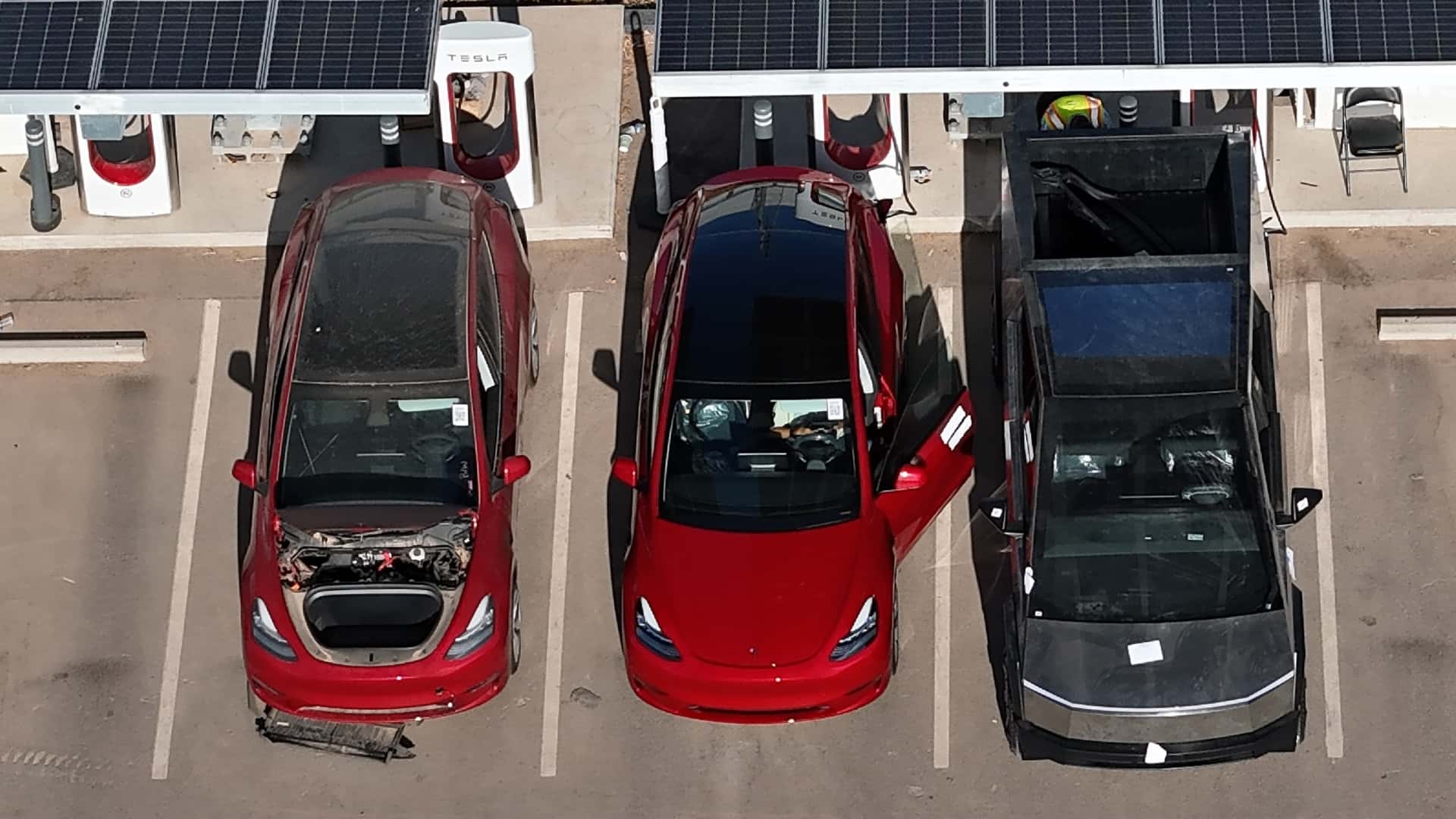 Mais recentemente, Joe Tegtmeyer – que durante anos grava vídeos de drones sobre a fábrica da Giga no Texas, compartilhou algumas fotos e um vídeo de um Tesla Cybertruck na estação Supercharger no local.